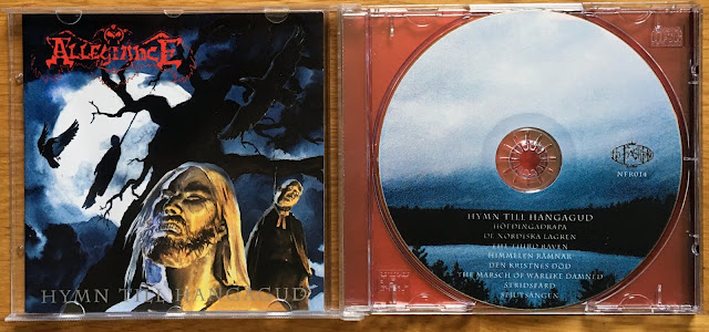 All 3 Allegiance records was released by No Fashion Records during 1996-99. It was the first album by Allegiance I ever bought and it’s still my favorite out of all their 3 albums. Some might think nostalgia plays a huge part in me thinking that it's their best album. But it's that great! It's probably their most known album if someone owns a Allegiance record it's usually “Hymn Till Hangagud” they have in their collection. Before being signed to No Fashion Records the band had released 5 demos. It wasn't until the 4th one the already mentioned “Odin Äge Er Alle” that the band started to play Black Metal and adopt the Viking/Pagan lyrics. Beside Bogge and Fredrik Andersson they have Mikael Almgren on bass, Pär Thornell plays guitar and he also wrote 4 of the lyrics for the album. While Bogge wrote 3 of them and Fredrik wrote 1 of the lyrics. Anyway this is a great album one that have a place in Swedish Black Metal history at least in my book as one says. Or my bookshelf rather where I keep all my CD's.