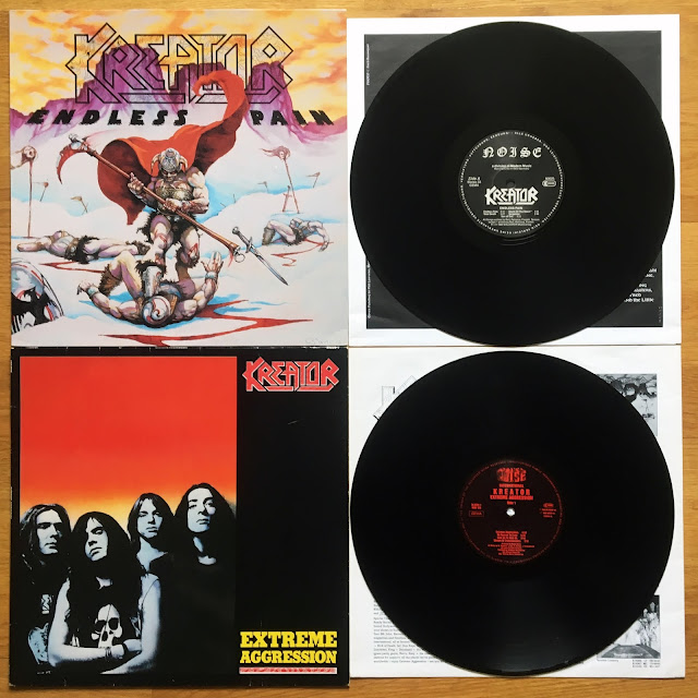 The two classic Kreator albums are both the German first print vinyls on Noise International. Why am I showing them together? Well I already posted my two favorite albums by Kreator. Number 1.) "Coma Of Souls" (1990) and number 2.) "Pleasure To Kill" (1986) and cannot chose which one of "Endless Pain" or "Extreme Aggression" is my 3rd favorite by the best band ever from the excellent German Thrash Metal scene.